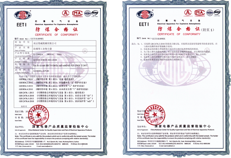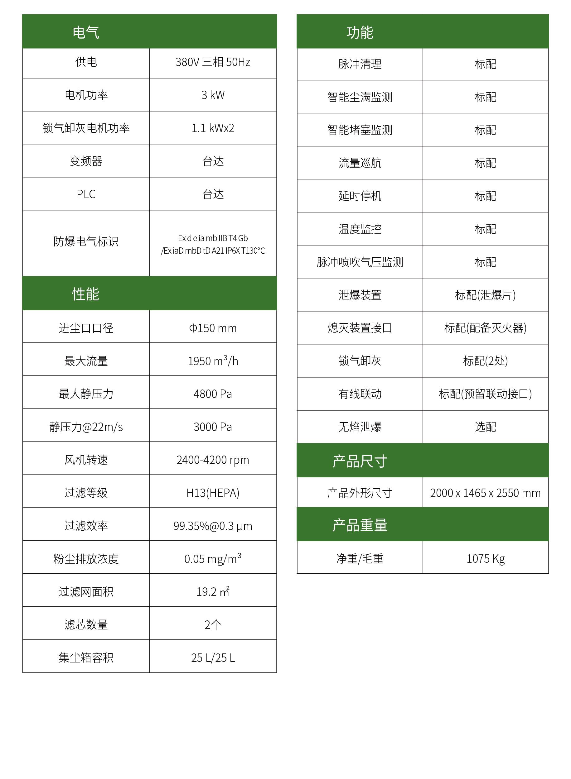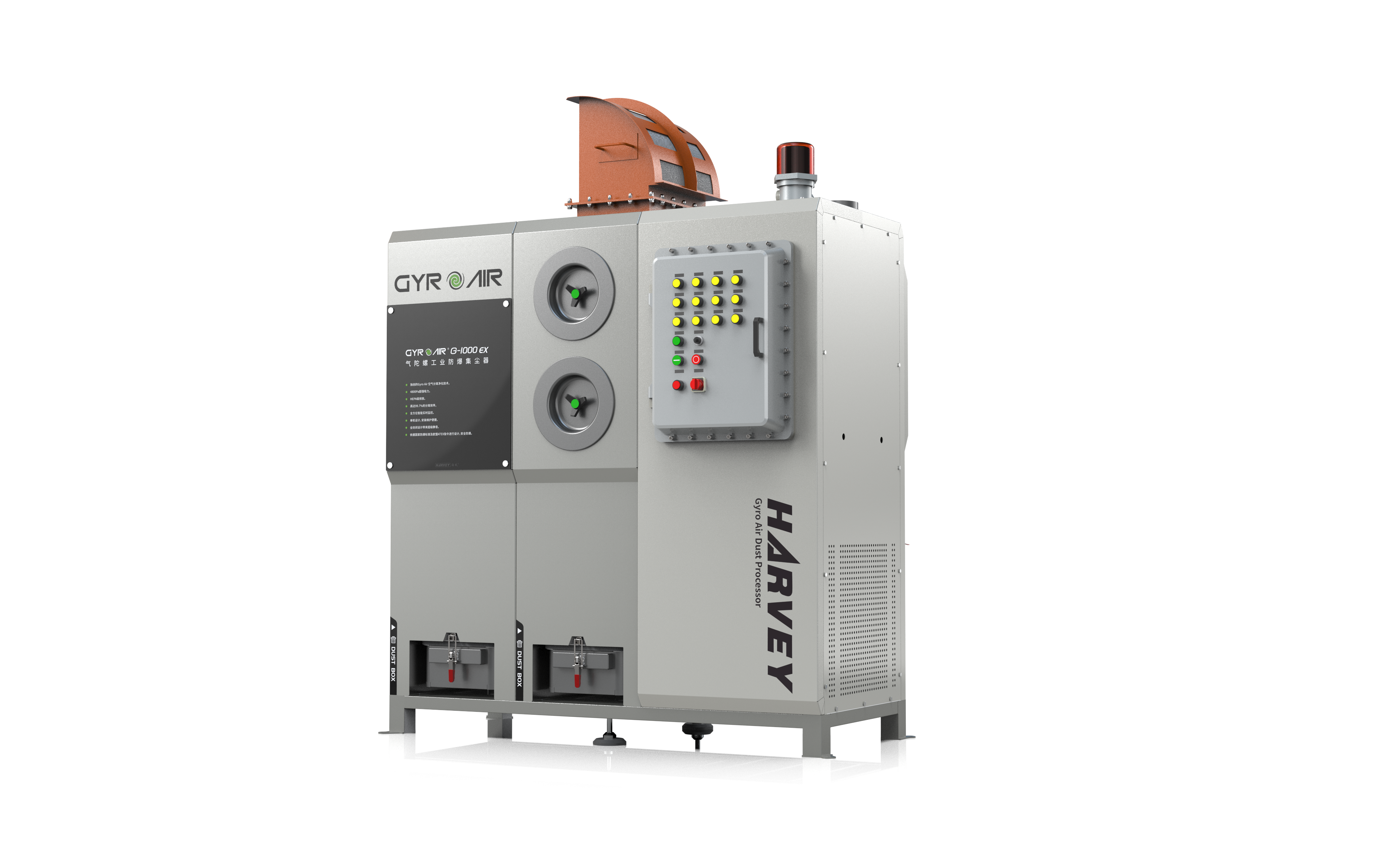 G-1000EX 气陀螺工业集尘器 产品采用气陀螺尘气分离技术,加之专门的高效离心风机设计、无线智能控制、低振动、 低风噪等核心技术的应用,并对结构外型进行顶级的工业设计。 安全防爆 G-1000Ex配备有一体式防爆柜,能够控制元件密封在防爆柜中,避免成为点火源。锁气卸灰阀能将收集的粉尘和脏室有效隔离,避免收集的粉尘参与二次爆炸。温度传感器能够监测吸尘口异常温度,及时报警和停机。机体顶部的泄爆装置,在发生爆炸后,可使火焰从单一泄爆口喷出,有效避免引起其它危险。G-1000Ex附带的灭火装置,可以在发生火灾后及时扑灭火源。 G-1000Ex防爆合格证 G-1000EX 集尘器产品用于工业除尘中,具有如下优点: 滤网不堵塞,设备可长时间有效使用: 99%以上的粉尘在进入过滤网之前,被分离掉,只有极少量的微细粉尘进入滤网,滤网负载很轻,长期使用,滤网不堵塞,可连续使用5000h~8000h。排放超洁净,除尘效果好: 因为滤网轻载,不容易堵塞,因此,过滤网可以采用高等级的滤芯材料,0.3μm以上的尘粒可以被过滤掉,最后排放出来的空气洁净: 排放浓度<50μg/m³(高于欧盟 100μg/m³技术标准,远远高于国内 300μg/m³技术标准), 颗粒物粒径小于0.3um。可室内使用:排放超洁净,以内循环方式工作。可放置于封闭的室内使用,便于室内安 装空调,室内可“冬暖夏凉”,能耗小。 产品应用情况 产品设备已广泛应用于以下易燃易爆的场景: 金属制品加工业:镁粉、铝粉、铝铁合金粉、钙铝合金粉、铜硅合金粉、硅粉、锌粉等。农副产品加工业:玉米淀粉、大米淀粉、小麦淀粉、果糖粉、果胶酶粉、小麦粉等。木制品/纸制品加工业:木粉、纸浆粉等。纺织品加工业:聚酯纤维、甲基纤维、亚麻、棉花等。橡胶和塑料制品加工业:树脂粉、橡胶粉等。冶金/有色/建材行业煤粉制备业:褐煤粉尘、褐煤/无烟煤粉尘等。 产品参数